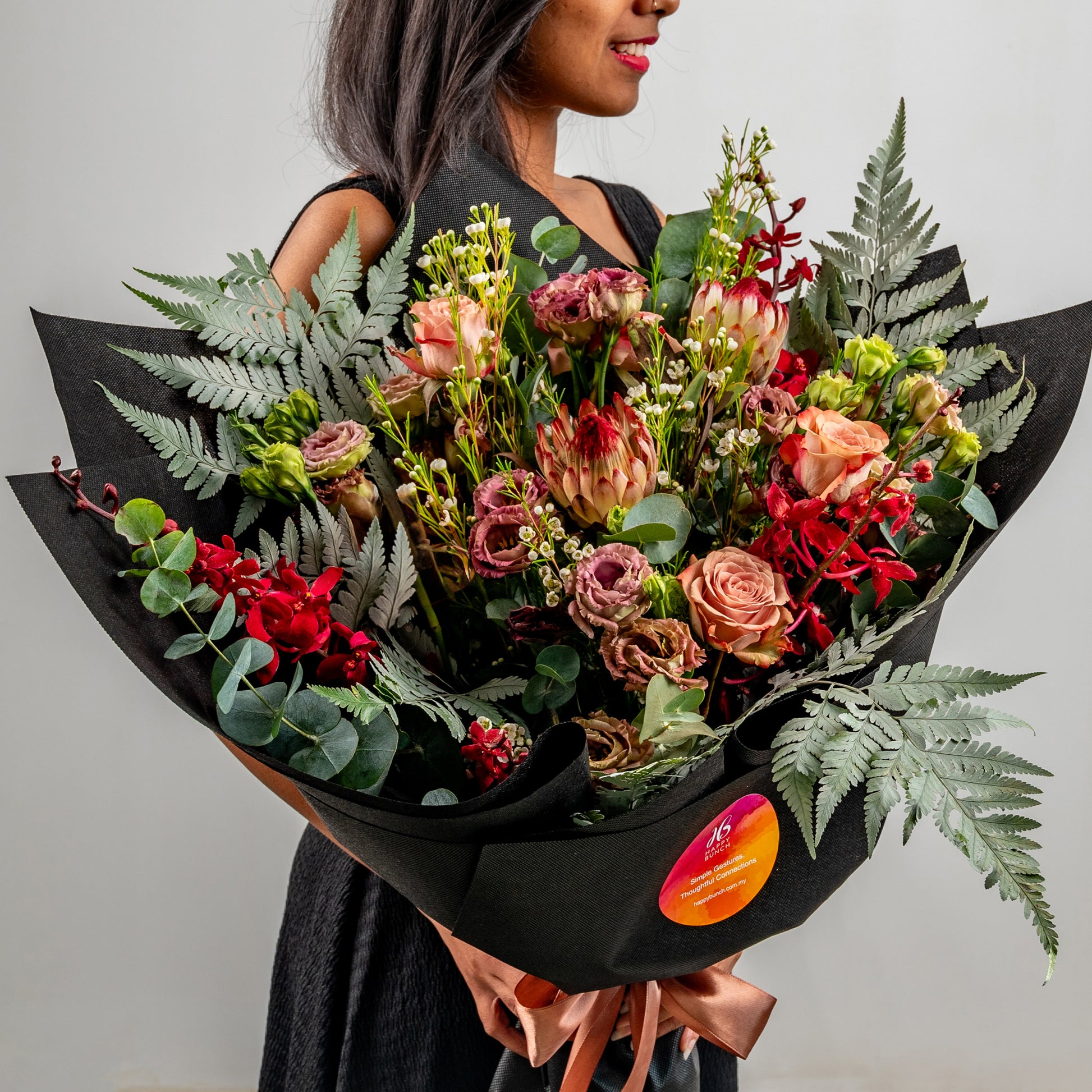 Indulge in the allure of this luxurious bouquet featuring protea, cappuccino roses, orchids, eustomas, and more in rich, reddish hues. Radiating soft grandeur, this arrangement boldly expresses deep emotions and is perfect for conveying your grandest feelings.