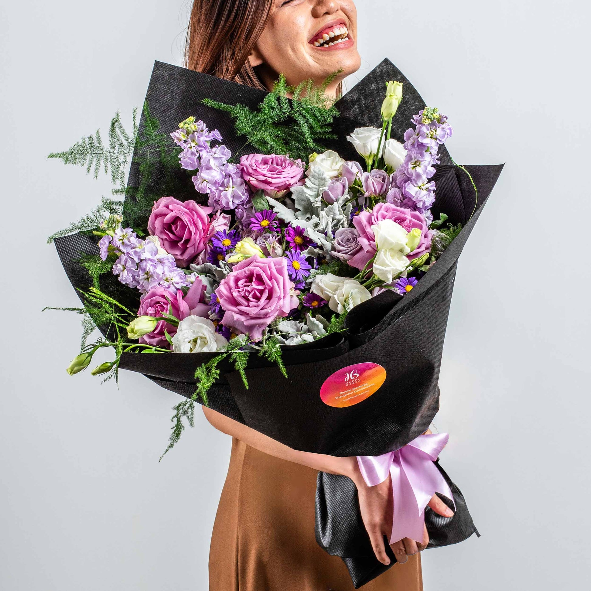 Dream is a stunning purplish bouquet with roses, Mathiolla, rose spray, eustoma, and Hana. Romantic and whimsical, this charming arrangement adds a touch of luxury to any occasion, perfect for expressing your sweetest feelings.
