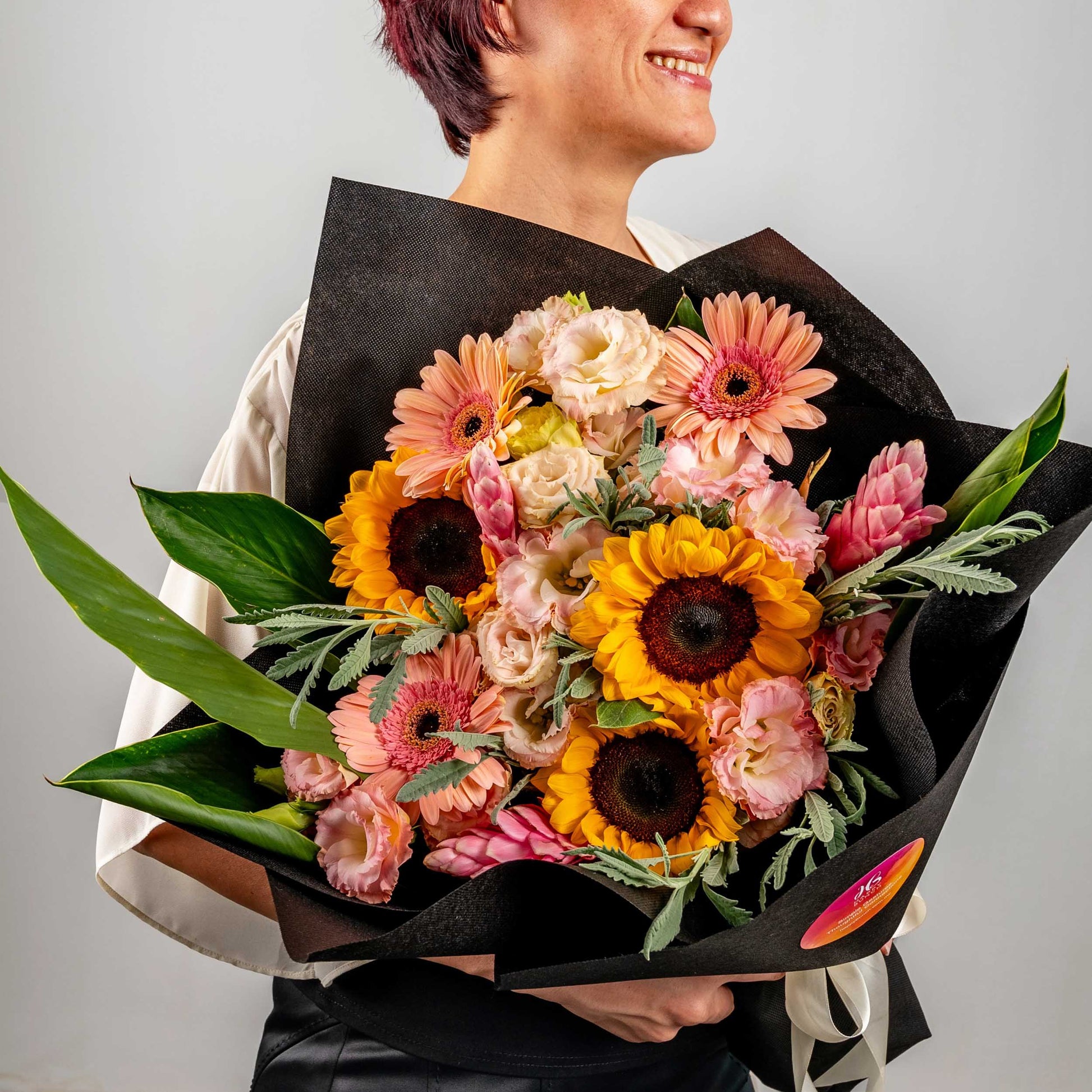 Celebrate the vibrant spirit of Glow, a cheerful and tropical bouquet featuring sunflowers, pink ginger, gerbera, eustoma, and more. Radiating a spring of happiness, this arrangement maintains its luxe feel, perfect for adding a bright glow to any occasion.