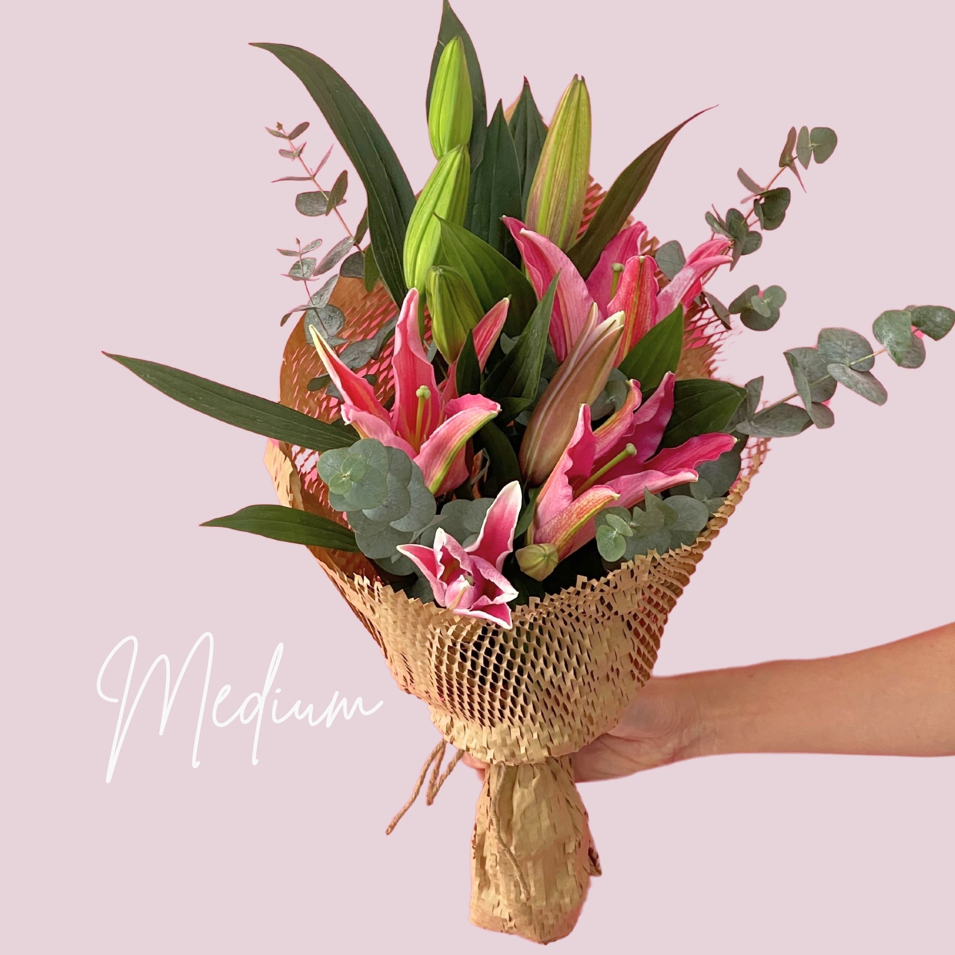 These bouquets come in small, medium, and large sizes. Medium is double the small, and large is triple. Also available as table top arrangements.