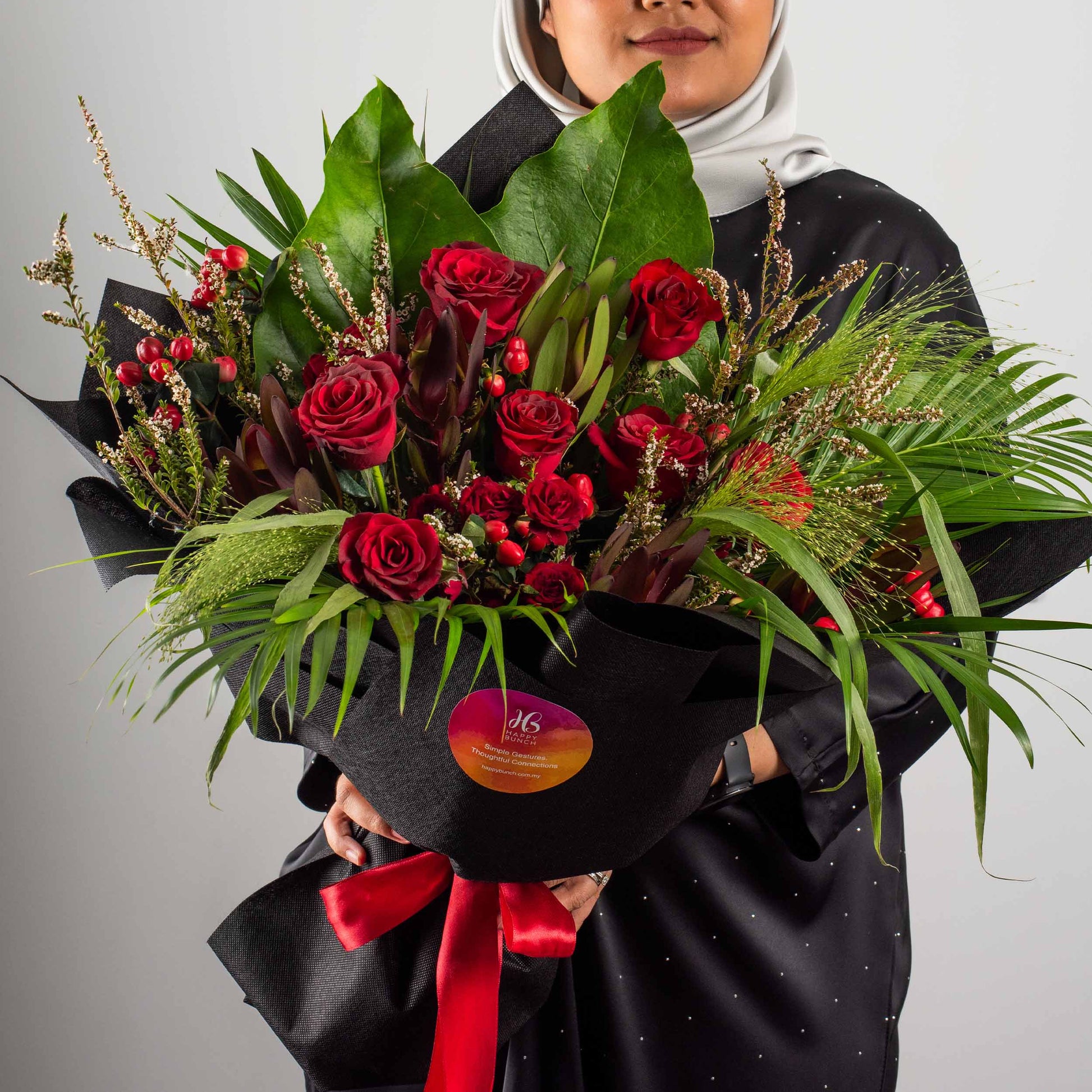 Experience the grandeur of our Majestic Bunch, a luxurious arrangement featuring leucadendron, roses, spray roses, Erica Snow Plum, and more. With its velvety appearance and striking red tones, this bouquet exudes regal elegance, perfect for making a statement at any special occasion.