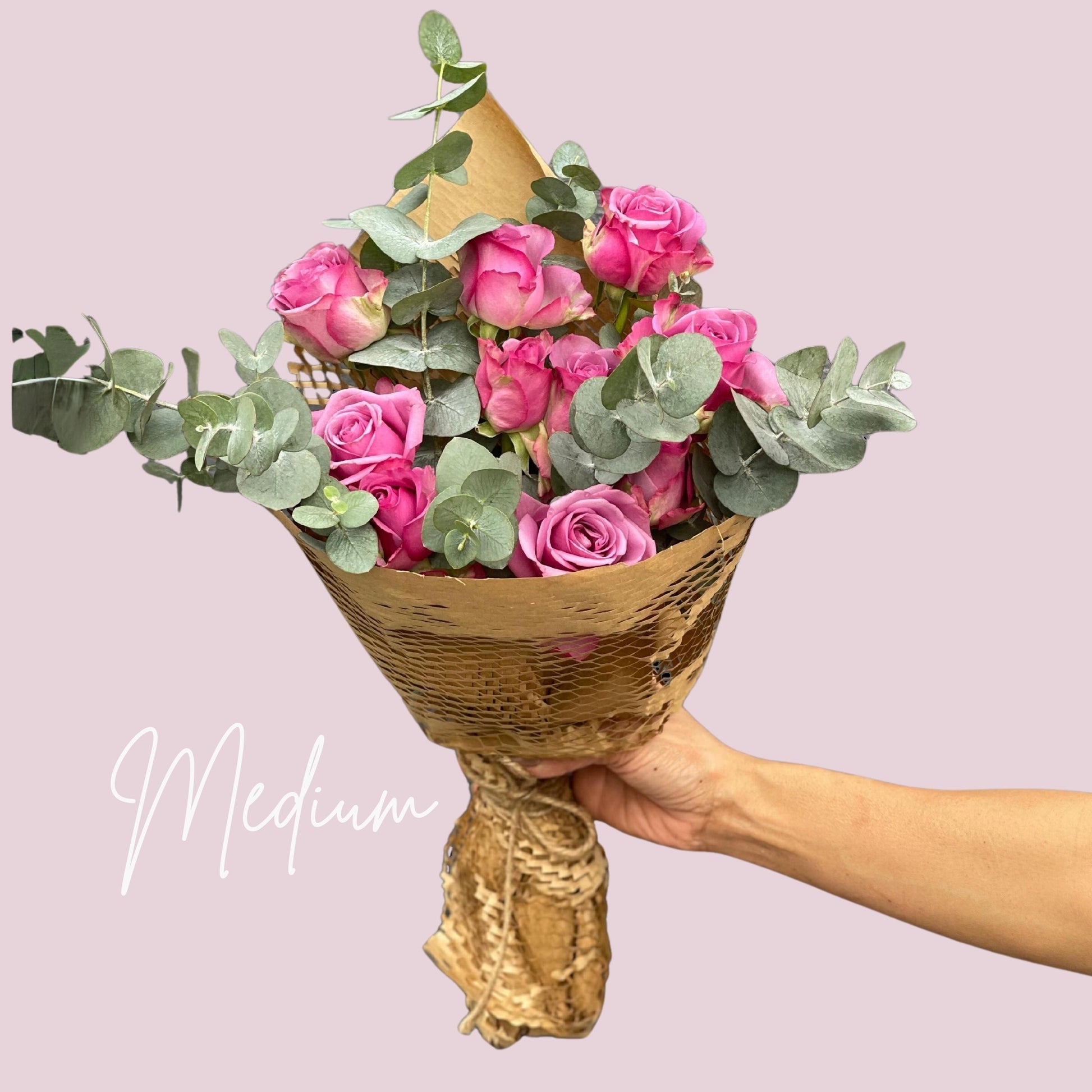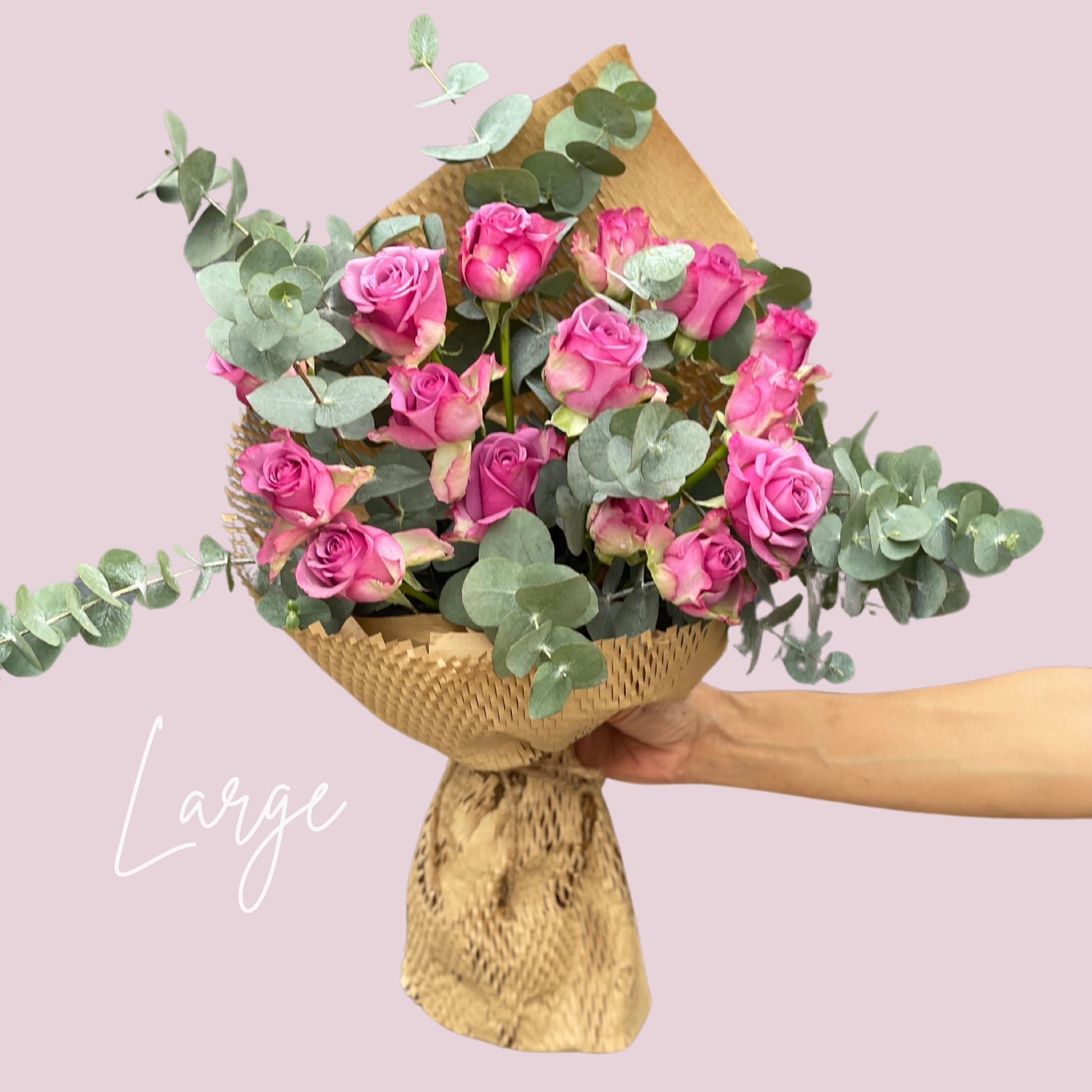 These bouquets come in small, medium, and large sizes. Medium is double the small, and large is triple. Also available as table top arrangements.