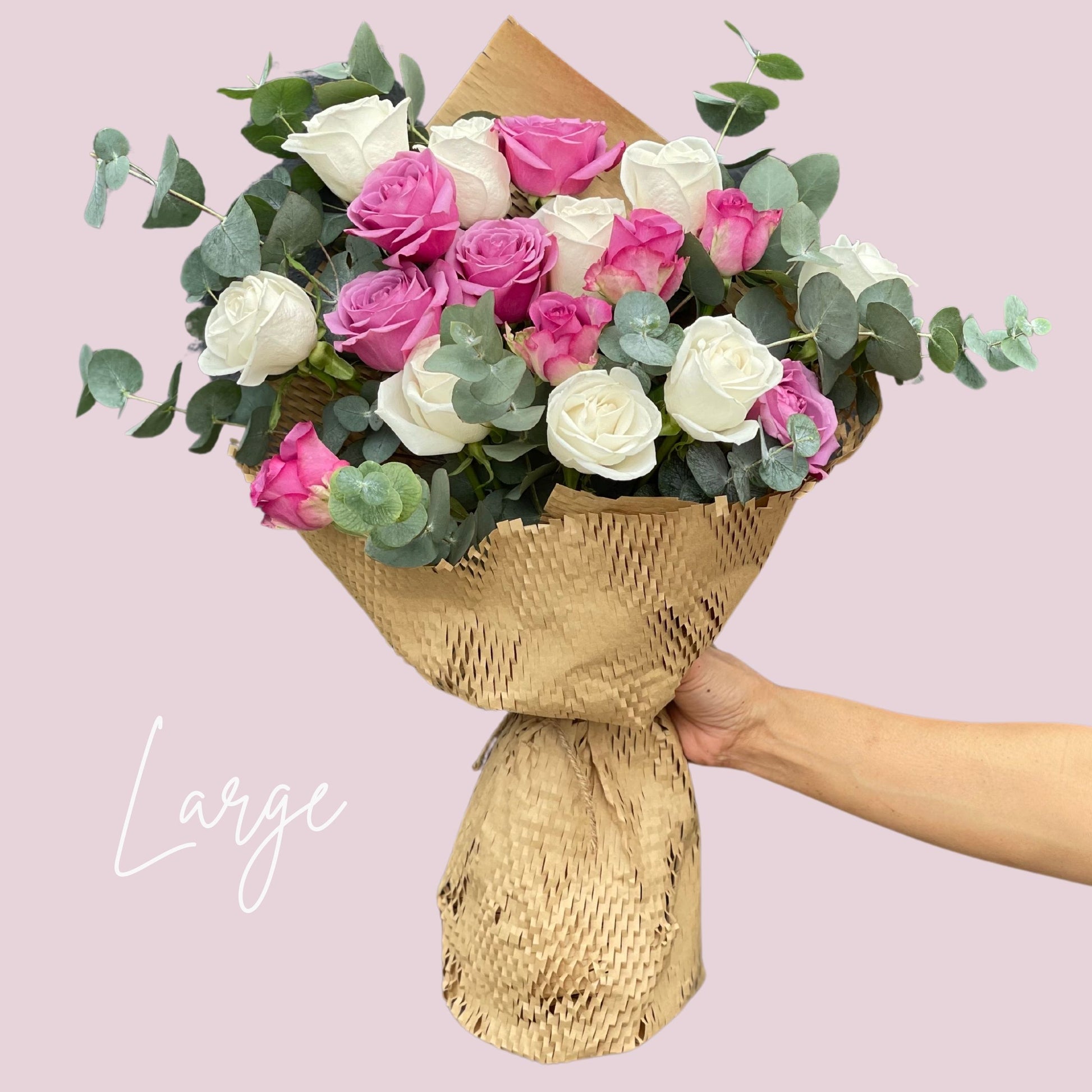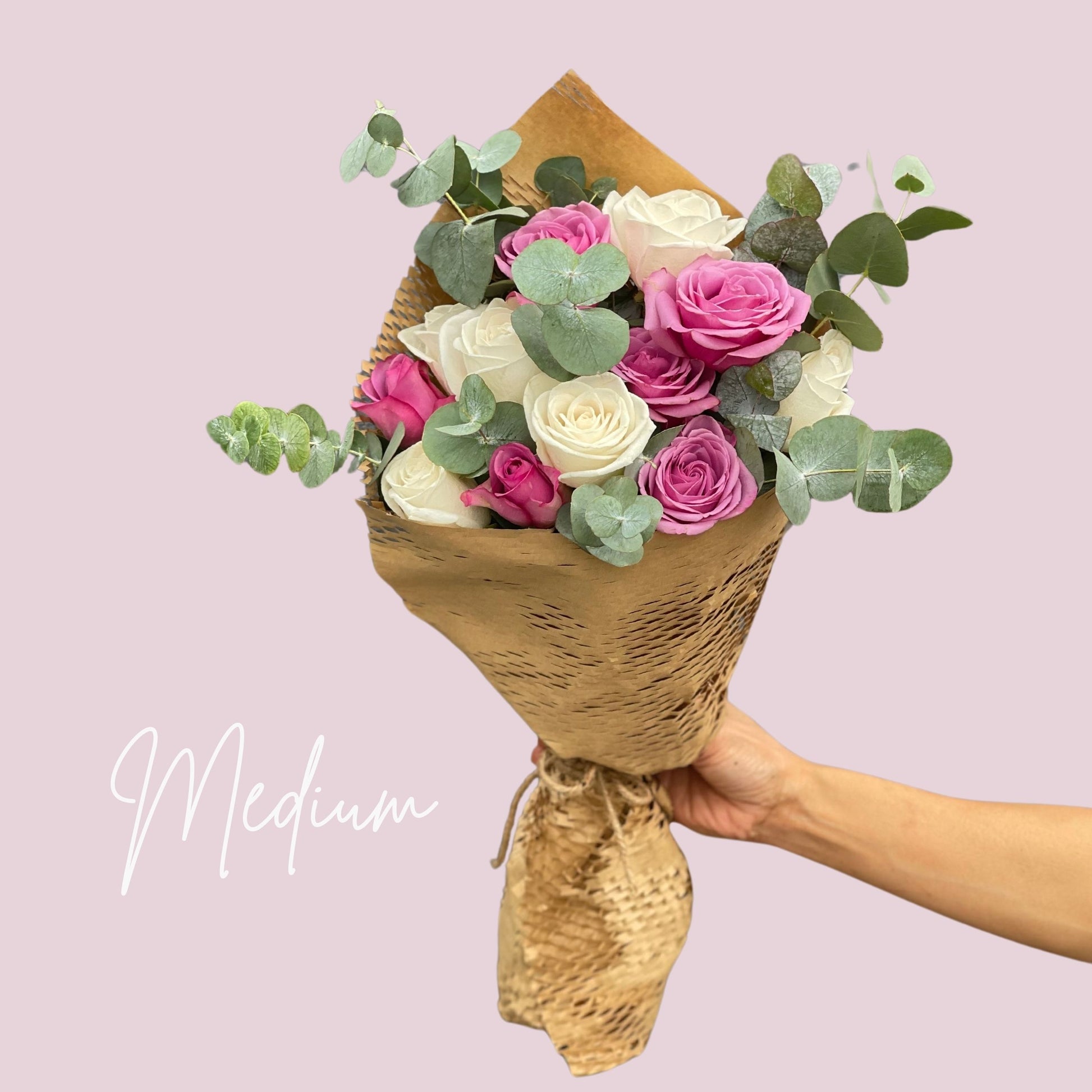 These bouquets come in small, medium, and large sizes. Medium is double the small, and large is triple. Also available as table top arrangements.
