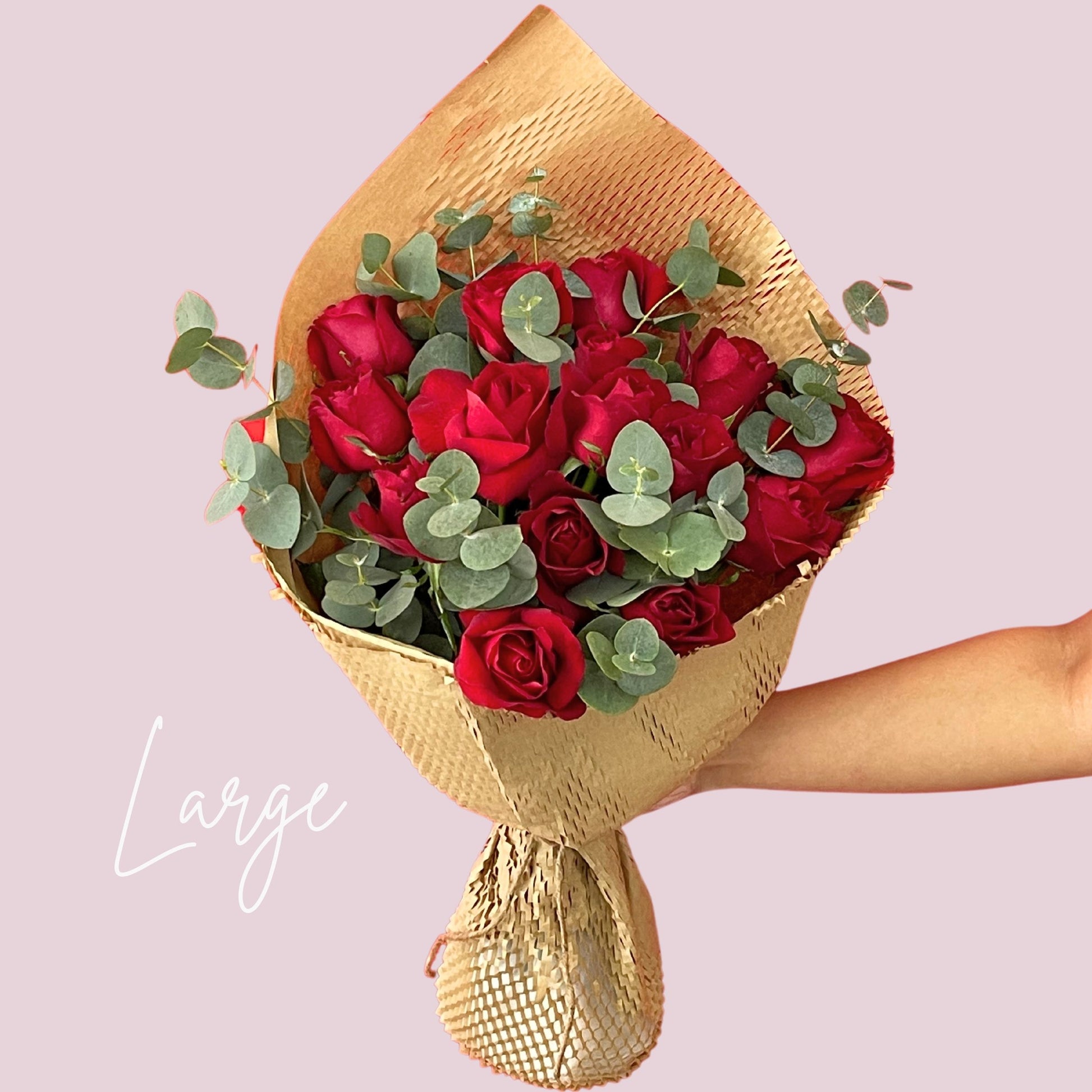 These bouquets come in small, medium, and large sizes. Medium is double the small, and large is triple. Also available as table top arrangements.